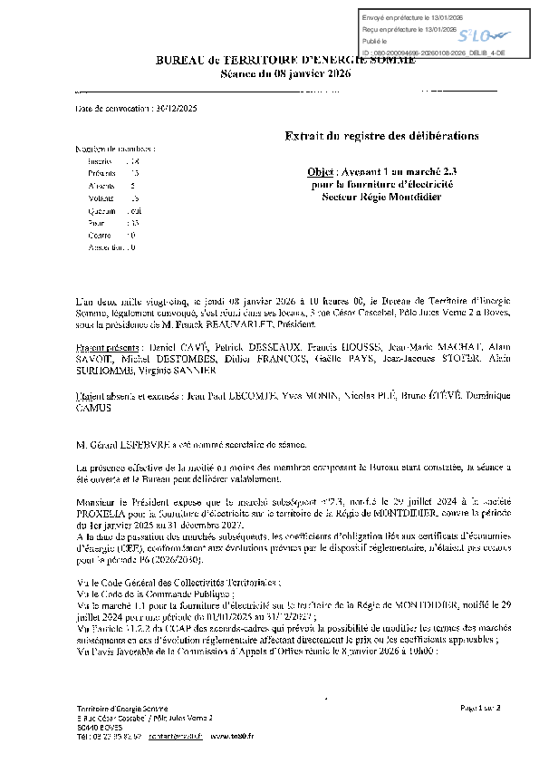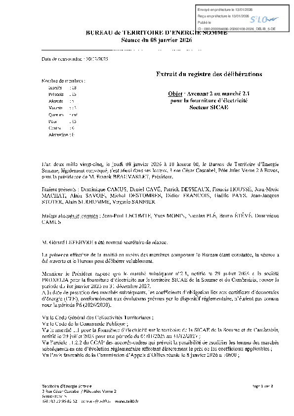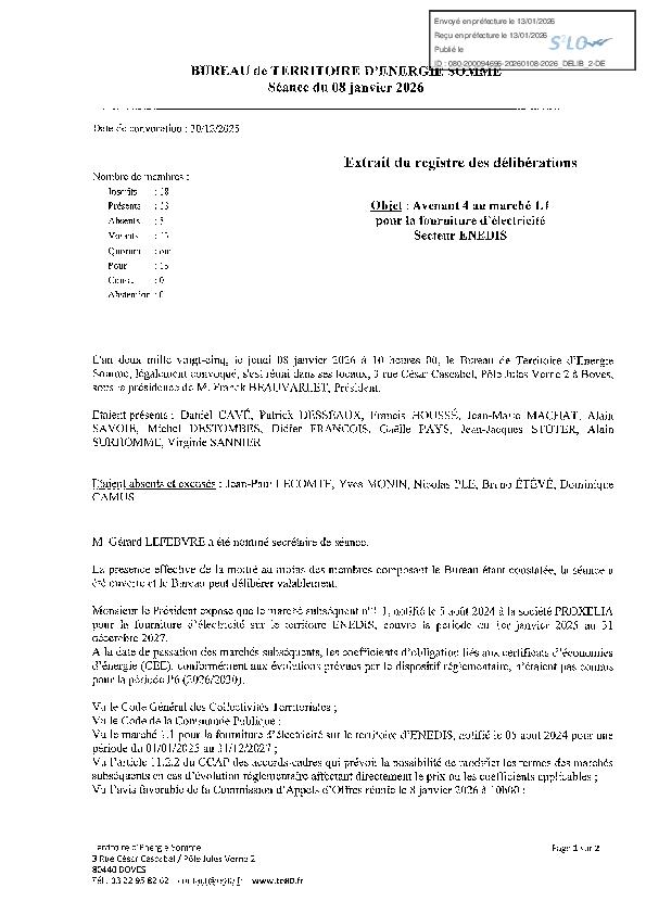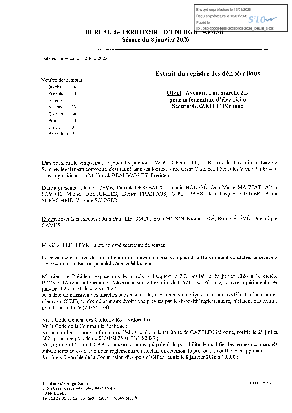 Avenant 1 au marché 2.2 pour la fourniture électricité Proxelia - Secteur Gazelec Péronne
